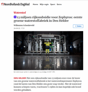 Noord-Hollands Dagblad publiceerde onlangs over de toekenning van 13 miljoen EUR subsidie voor de bouw van een groene waterstoffabriek in Den Helder – onderdeel van het Zephyros project. Een enorme stap voorwaarts in de energietransitie in de Noordelijke energieregio – de ‘energie-vallei’ van Nederland.